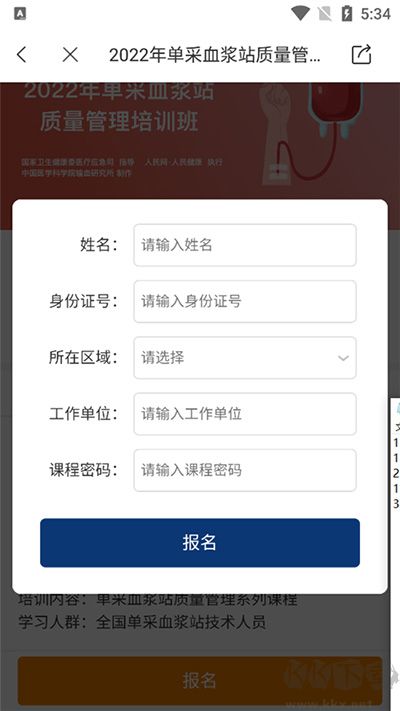 4、随后填写个人姓名、身份编号、所在地区、工作机构及课程密码。