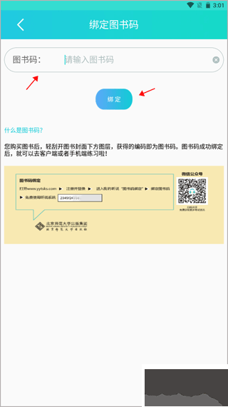 2、在输入框中输入你购买书籍下方的图书码,输好后就可以点击绑定,这样就能成功绑定了。