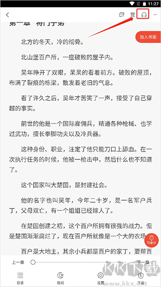 3、进入到小说阅读页面,点击空白处,就会弹出很多功能,右上角有一个耳机的图案。