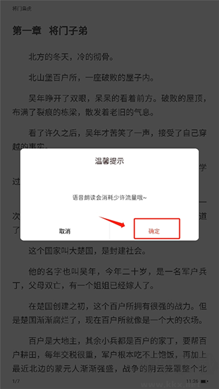 4、第一次使用的话会出现一个语音朗读流量的消耗,点击“确定”就可以了。