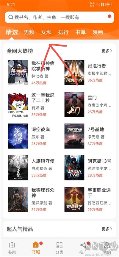 2、在首页中,我们可以看到精选、男频、女频、排行、书单、漫画等。