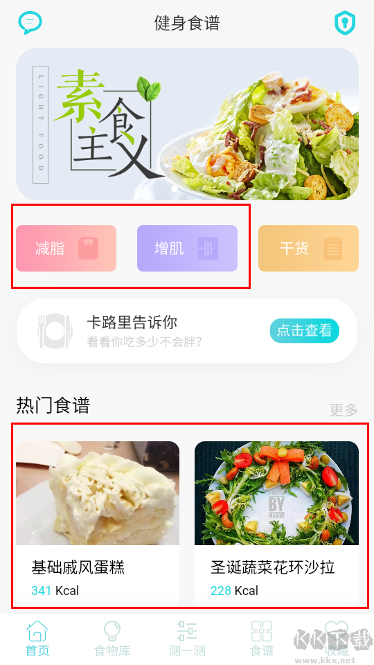 1、在首页,可以看到热门菜谱的推荐以及可以选择是减脂还是增肌;