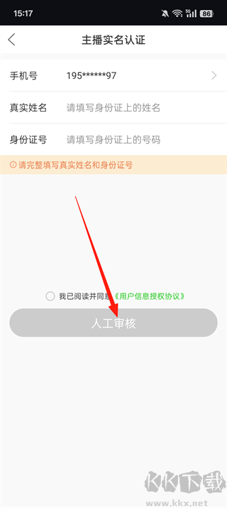 3、实名信息填好之后,点击【人工审核】,审核通过之后就可以开播了