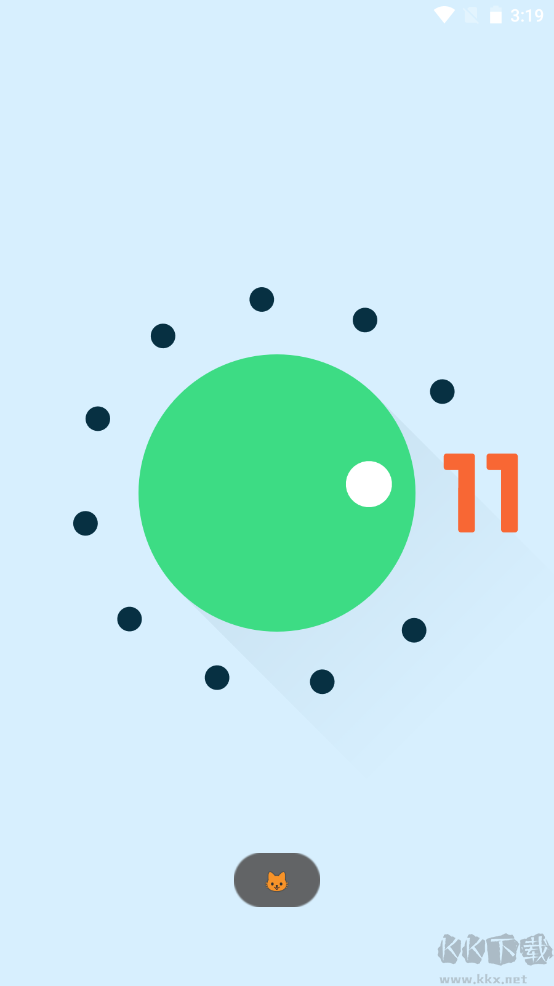 3、安卓11:按住白色按钮旋转,转到特定位置后,会出现数字“11”,转盘下方显现小猫图案,即开启安卓11的在线养猫彩蛋。