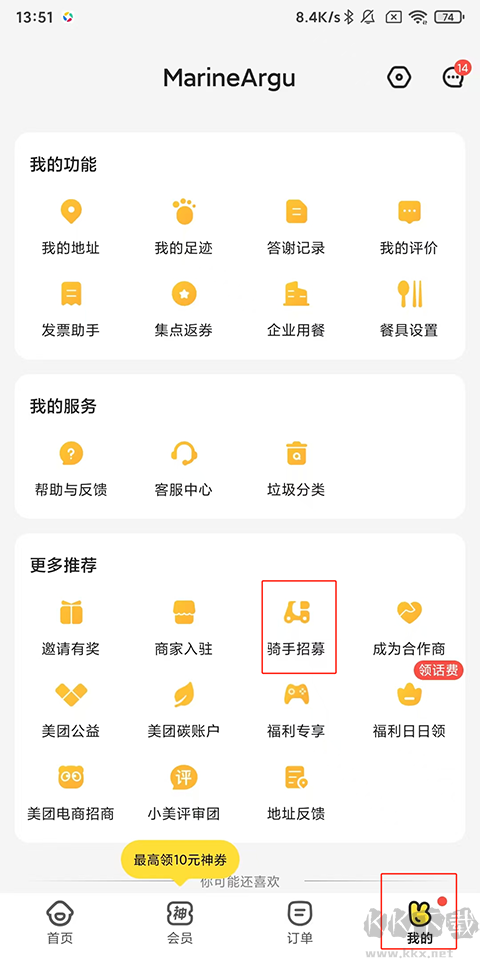1、打开美团外卖APP后,点击右下角的“我的”选项,找到“骑手招募”入口:在“我的”页面中,向上滑动屏幕,找到并点击“骑手招募”选项。