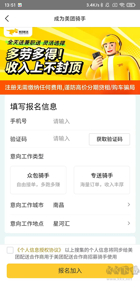 2、填写报名信息:在骑手招募页面中,输入你的报名信息,包括意向工作城市、工作地点、工作类型等。然后输入手机号,系统会在三个工作日内给你反馈。