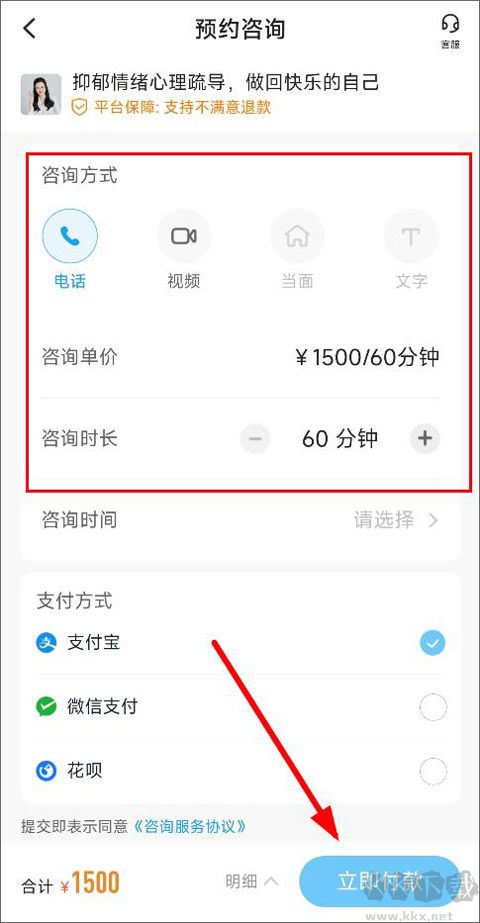 5、选择咨询方式(电话、视频)、单价、时间,付款即可预约成功。