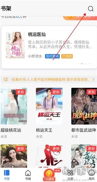 1、打开软件,点击“书架”,在页面右上角点击搜索