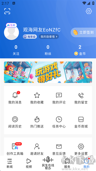 可查看【关注、粉丝、金币】情况,还有【我的消息、我的收藏】等功能,同时提供【创作工具箱、意见反馈、更多设置】等服务,方便用户管理个人账号和参与平台互动。