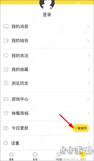 4、在个人界面中选择“今日更新”功能,点击“一键缓存”就可以对漫画进行缓存了。