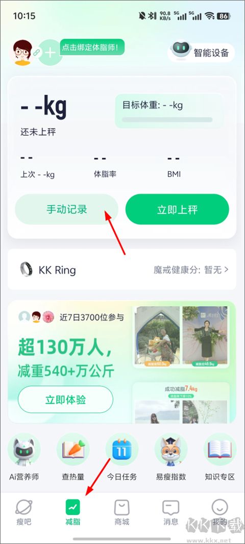 1、打开瘦身减脂app,进入后点击下方“减脂”再点击“手动记录”;