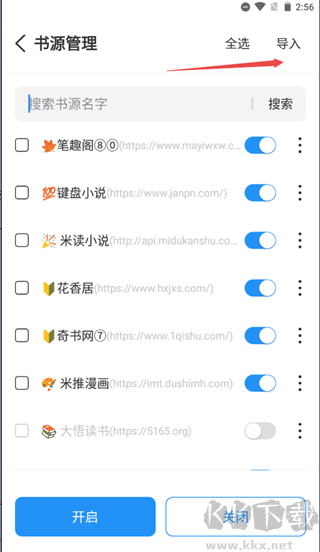3、跳转到书源管理页面后点击右上方的导入按钮。