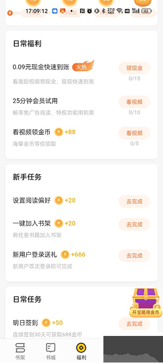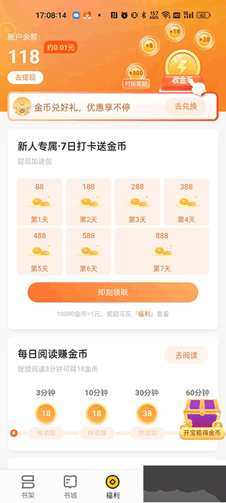 2、点击中间下方的福利按钮,即可每日签到领取金币,金币可以兑换成零钱提现;