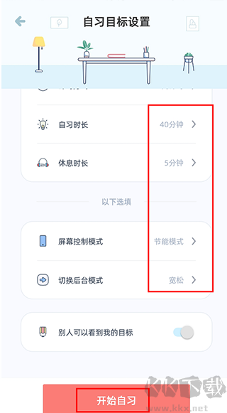 4、设置自习时间,设置完成后,点击【开始自习】;