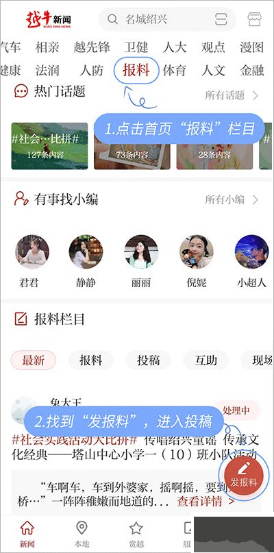 1、打开越牛新闻客户端→点击文末左下方#社会实践活动大比拼#进入话题,或者在报料栏目发布报料。