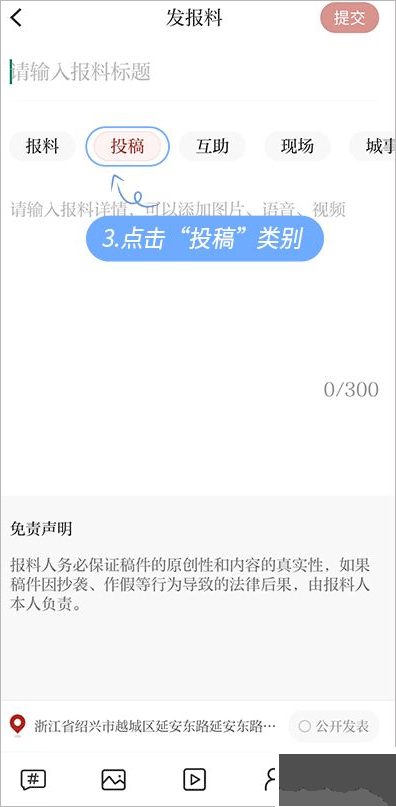 2、接着发布报料时记得选择【投稿】类别,输入投稿内容、图片等信息后点击提交即可。