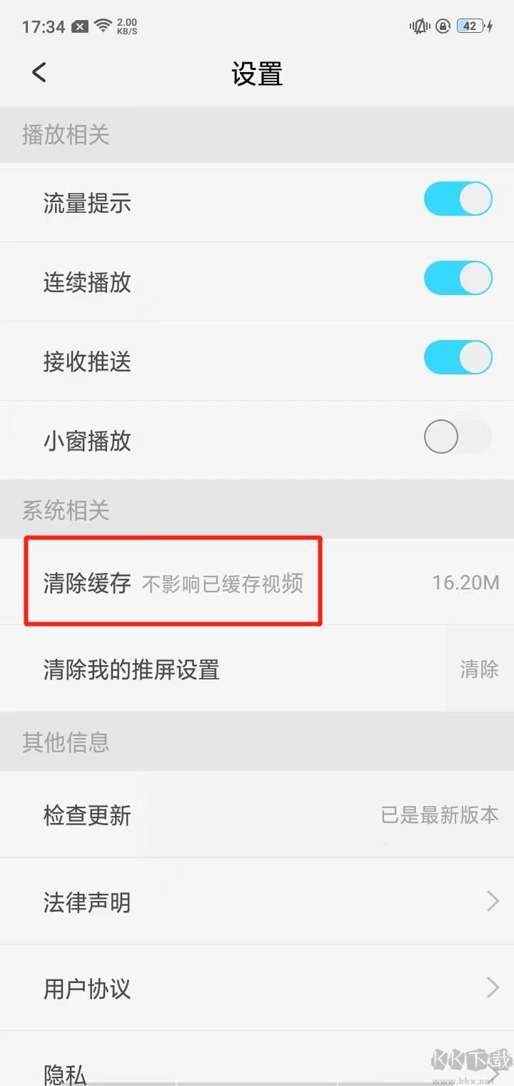3、往下滑动,点击【清除缓存】即可。(不影响已经缓存的视频哦~)
