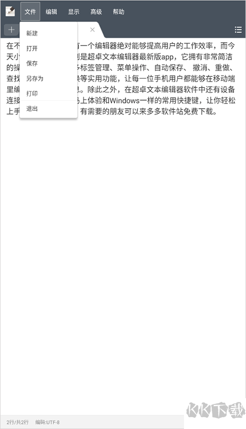 1、这个应用类似于系统自带的记事本程序,你可以用来记录日常的文字信息,内容编辑完成后,点击文件菜单就能执行保存文档、打印输出或者新建文件等操作。