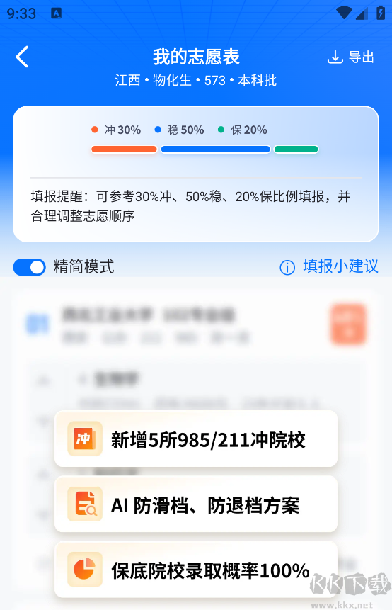 院校优先填报:基于目标院校近五年录取分数,结合智能推荐算法,优先推送录取概率更高的学校;