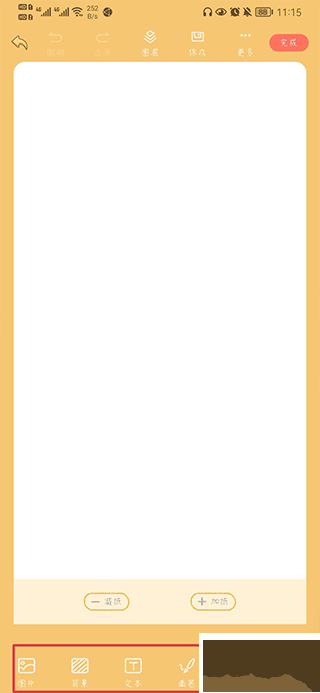 3、在下方工具栏中,可以添加图片、背景、文本、贴纸等,用来美化手帐