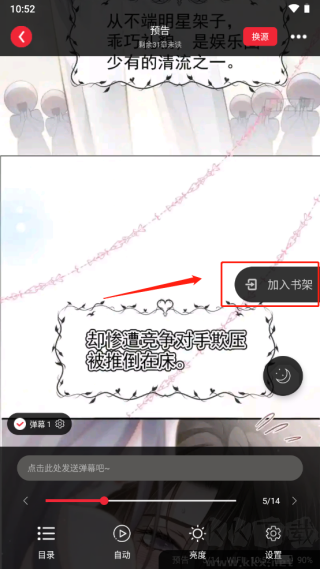 6、点击漫画中间可以出现自动播放,亮度调节等,点击中间的“加入书架”