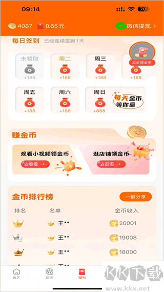 1、使用手机微信登录app后即可在福利界面中通过签到、观看视频、领取平台金币、做任务等方式来进行赚钱
