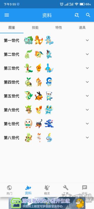 查询的方法用很多种,最基础的是按世代查询,每个世代标题处会有当代御三家的图片,方便辨识
