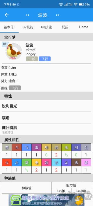 我们以“波波”为例,点击波波,可以看到波波的详细技能,下拉可查看详细信息,特性、蛋组、种族值以及进化链