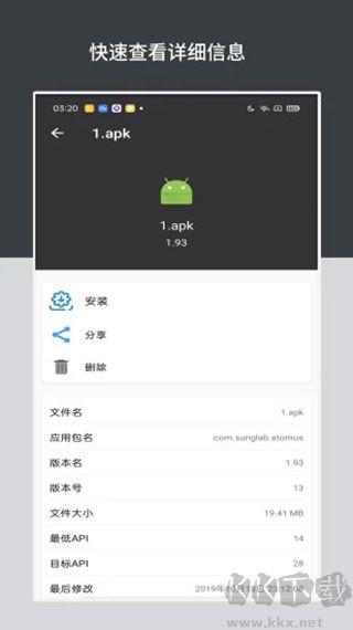 2、支持查看安装包的文件大小、数字签名、包名、更新时间等关键属性;