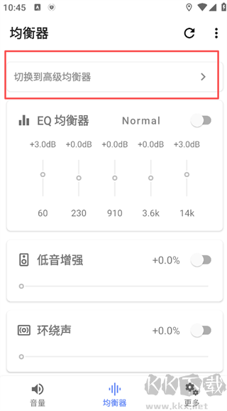 切换到均衡器板块,您可以调节EQ(均衡器)、低音增强以及环绕声效果。此外,还可切换至高级均衡器模式,提供更为精细的音效调节。