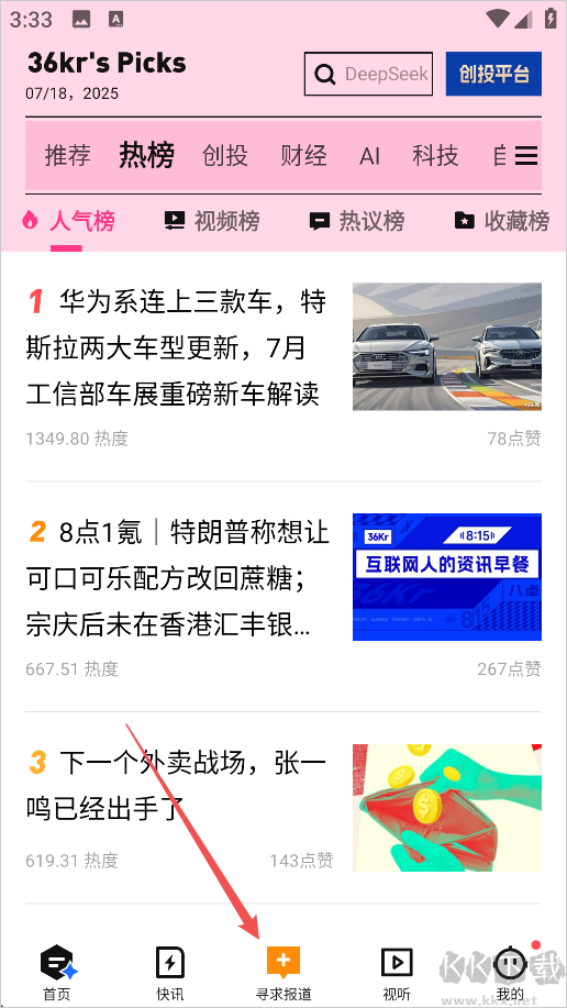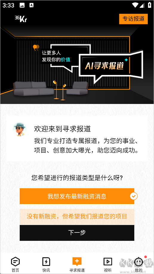1、进入36氪App后点击下方的寻求报道