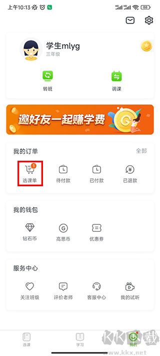 2、在个人主页中点击【选课单】。