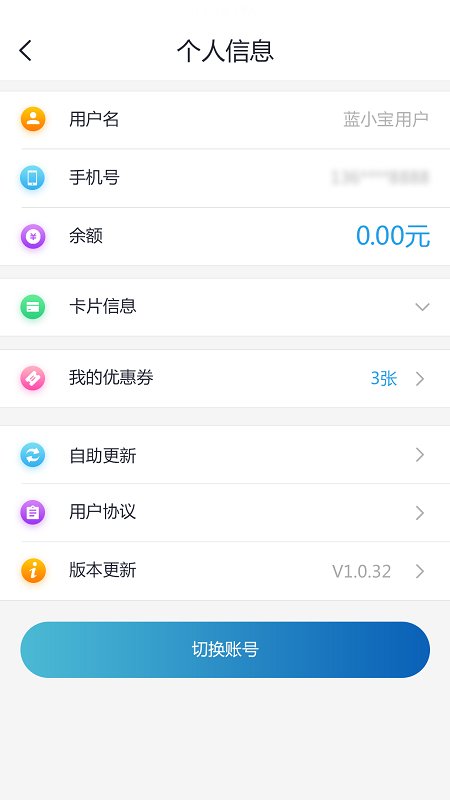 4、个人信息管理,自己的余额、卡片信息和优惠券可以在个人中心进行管理