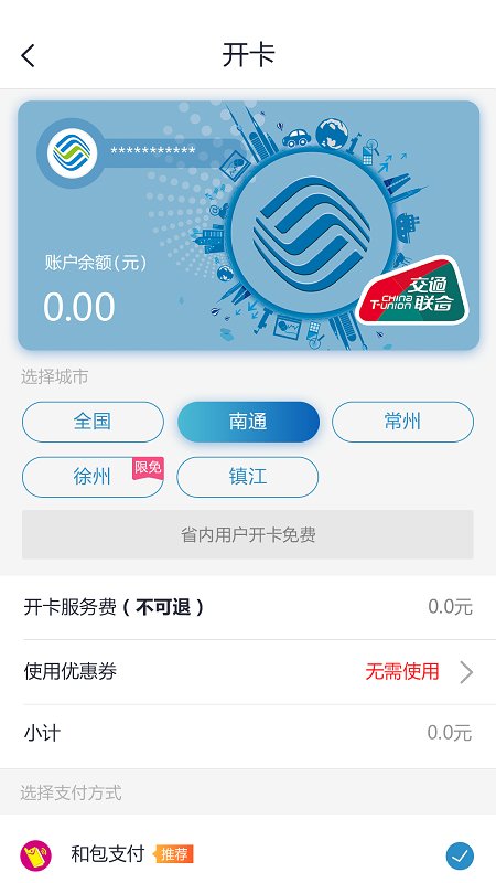 2、全国范围适用,既能够选择江苏省之内的城市也能选择全国通用的卡片