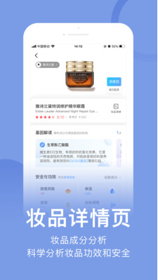 2、了解个人肤质,查询化妆品及成分,查看化妆品匹配分数,寻找适合自己的护肤品