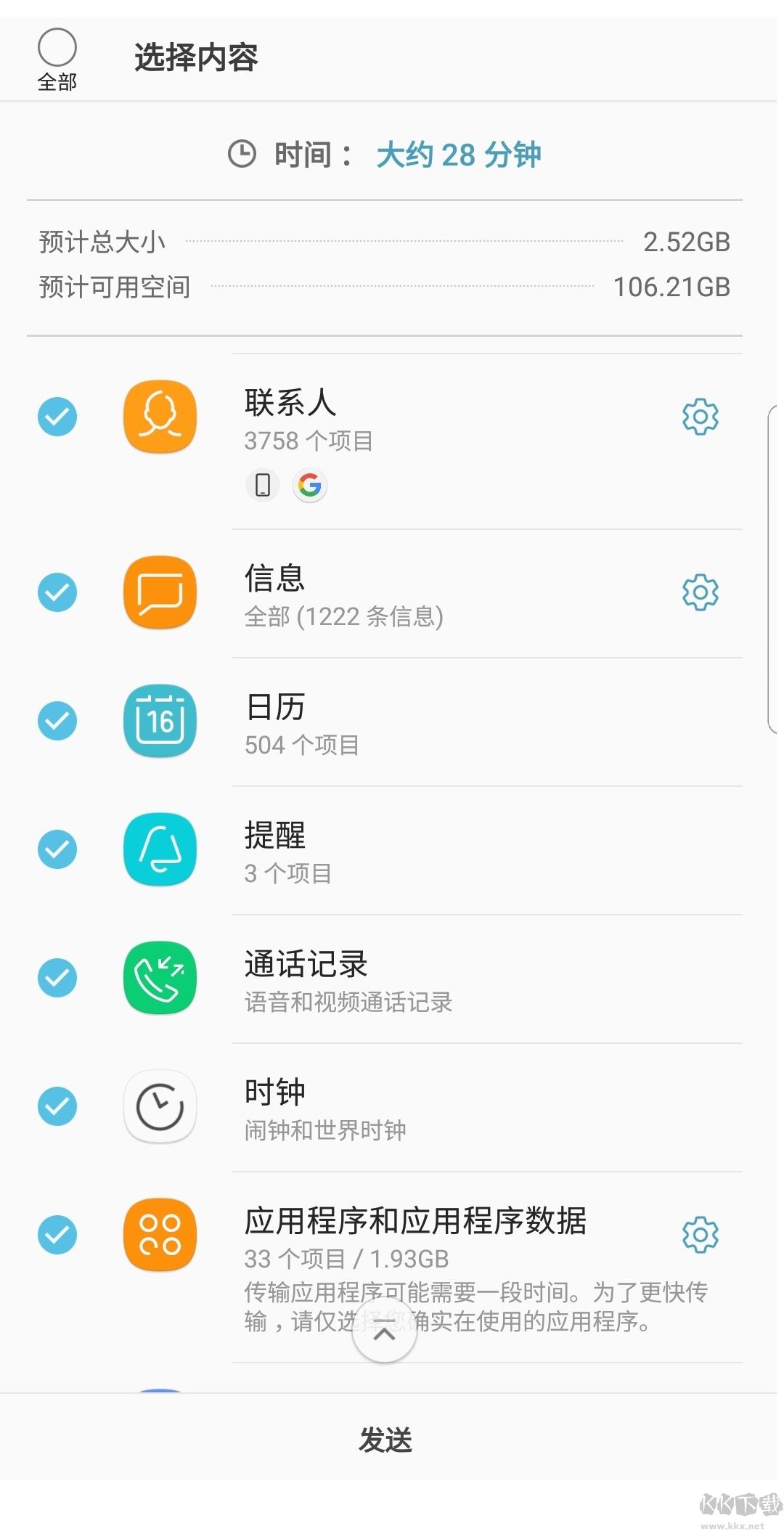 联系人、日历 (仅限设备内容)、信息、照片、音乐 (仅限无 DRM 的内容、不支持 iCloud)、视频 (仅限无 DRM 的内容)、通话记录、备忘录、闹钟、WLAN 设置、壁纸、文档, 应用程序数据 (仅限 Galaxy 设备) 和主屏幕布局 (仅限 Galaxy 设备)