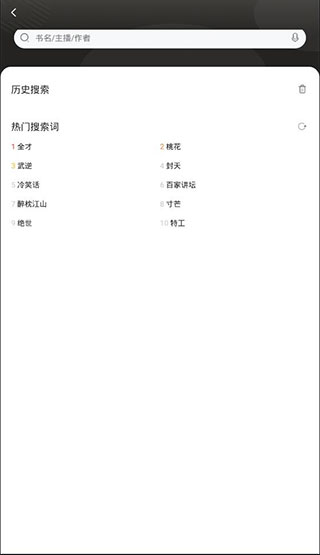 5、最后是搜索页面,用户可以在这搜索书名/主播/作者,页面内还会提供历史搜索记录和热门搜索词供用户参考。