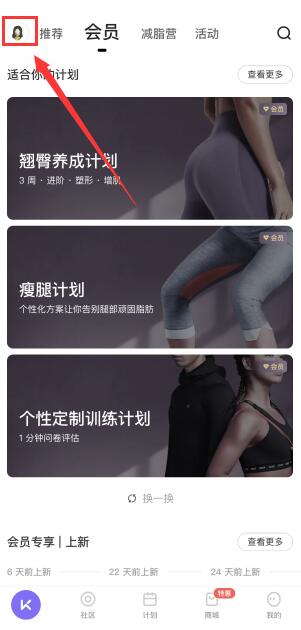 1、打开keep点击头像,在首界面中点击左上角的头像。