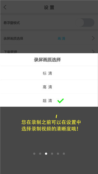 2、进入软件的【设置】界面,可以看到我已经开启了会员功能的【关闭所有广告】,还有这里我点击【录屏画质选择】;这里可以看到“高清模式”和“超清”模式都是需要vip才能开启,但是这些我们都可以随意使用。