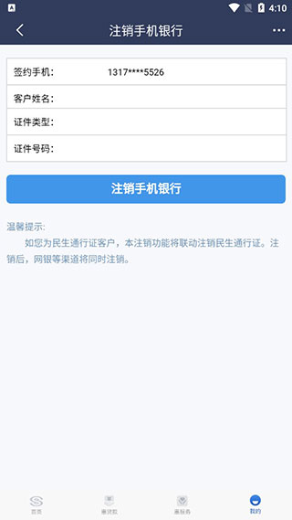4、在这里输入您的真实姓名、证件号码,点击注销手机银行即可。