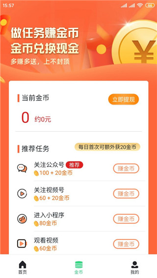 2、点击金币可以做任务挣金币,积攒到一定数量可以提现