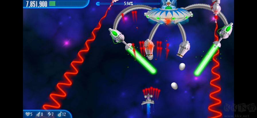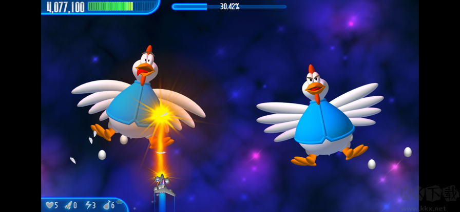 1、控制好战机不断移动,一旦出现了小鸡,就能使用武器快速攻击。