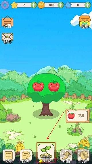 1、进入游戏,依据图示指引,点击 “育苗” 选项,开启水果培育第一步。