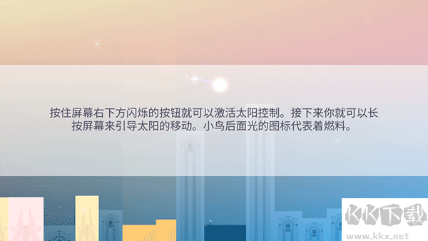 7、按住屏幕右下方闪烁按钮激活太阳控制,长按引导移动,小鸟后光标为燃料。