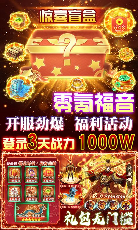 3、注册必得赠送Vip6、648充值卡礼包、悟空金甲时装、极品坐骑