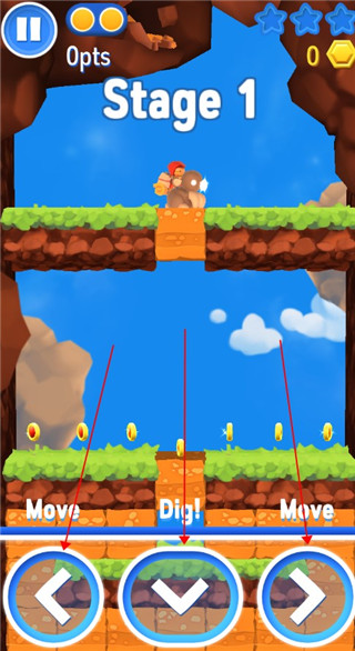 星光冒险的操作很简单。左右按钮是左右移动,按下向下按钮,鼹鼠会带我们下潜到地下。注意:下潜动作只能在黄色土块上完成,其他地方不行。如果你想攻击,你只需要点击屏幕。但是游戏的下潜键设置在左右键中间,设置时觉得操作起来不方便。如果下潜键和攻击键设置在右下角,左右键设置在左下角,玩家操作起来会方便很多。