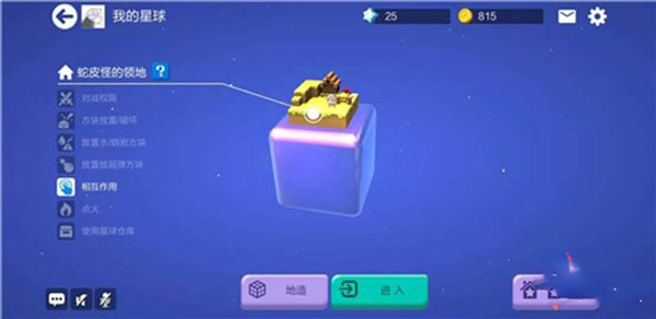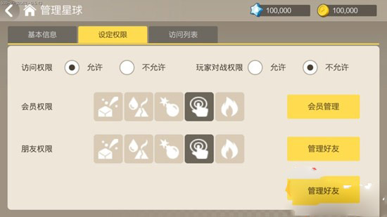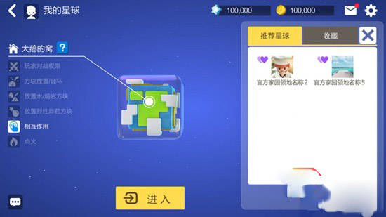 3、选择地形后还可以更改星球的名字,这个随你喜好咯!安置完毕后,还可以设置是否邀请小伙伴来家中做客。担心熊孩子?没关系,可以设置是否允许相互伤害、破坏。所以不用担心你不在线的时候家园被破坏