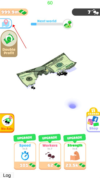 1、首先大家进入小蚁帝国游戏,可以看到蚂蚁需要搬运的物品,也可能是食物,这次小编的是钞票。