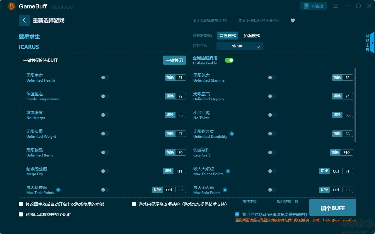 翼星求生二十二项修改器是一款功能十分强大的游戏辅助修改器工具,大家可以去帮助自己自由的修改设置拥有无限生命,体温恒定,无限体力,无限氧气,不会口渴,无限耐久度,最大天赋点,最大个人点,无限物品,超级经验值,快速制作等二十二项功能内容去帮助自己解决各种游戏中遇到的困难与挑战,体验轻松的战斗以及多样化的玩法,感兴趣的朋友们千万不要错过哦,快来KK下载体验一下游戏吧!
