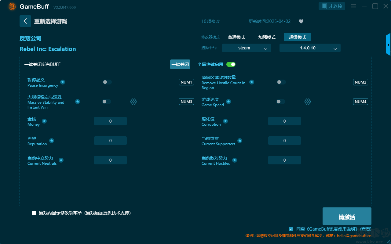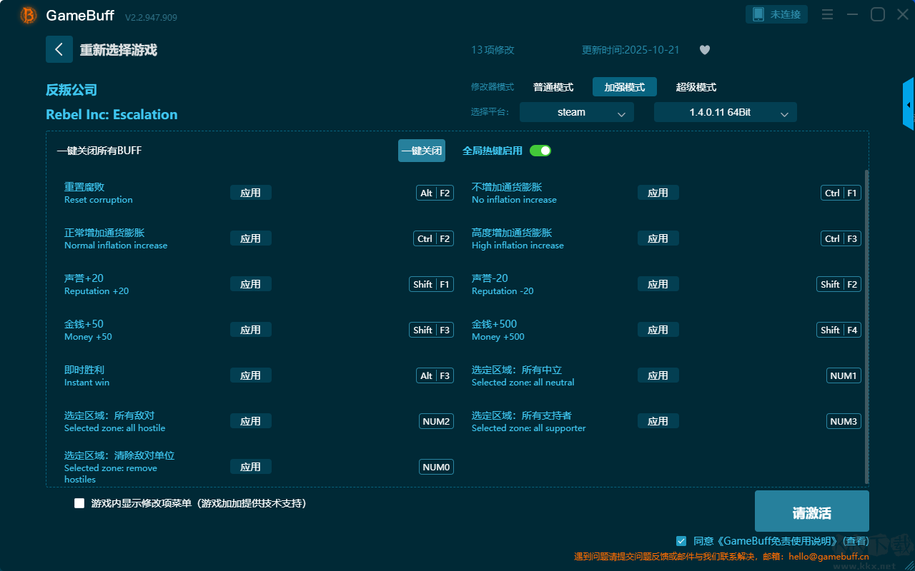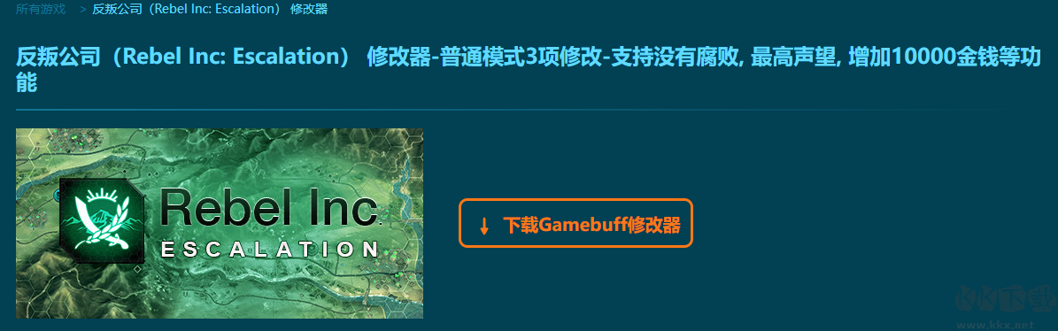 反叛公司三项修改器pc中文版是一款专业的游戏修改辅助工具。这款工具可为游戏反叛公司进行游戏辅助修改,玩家可从三种模式中选择一项激活功能。支持一键开启,不增加通货膨胀、正常增加通货膨胀、高度增加通货膨胀、金钱+50、金钱+500、声誉+20等十三项加强模式修改功能。需要的小伙伴快来KK下载站下载体验吧。